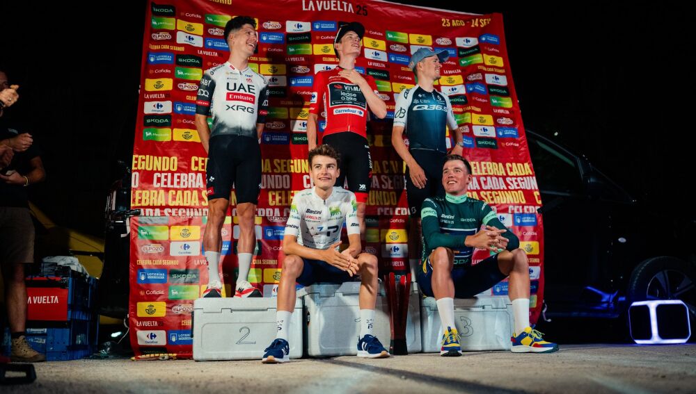 El Visma dio al campeón danés el homenaje que merece. En las instalaciones de su hotel en Madrid, el equipo improvisó un podio con tres escalones formados con neveras sobre un fondo publicitario oficial de la Vuelta. La ceremonia improvisada contó con la presencia del portugués Joao Almeida y del británico Tom Pidcock, segundo y tercer clasificados, respectivamente, y los tres recibieron los trofeos oficiales de la carrera.