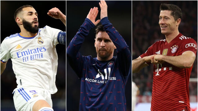 Karim Benzema completa el tridente de favoritos, con elogios del mundo del fútbol por su juego... y también por sus cifras. El francés acabó la campaña 2020-2021 con 30 dianas y 12 pases de gol en 46 partidos.