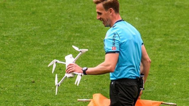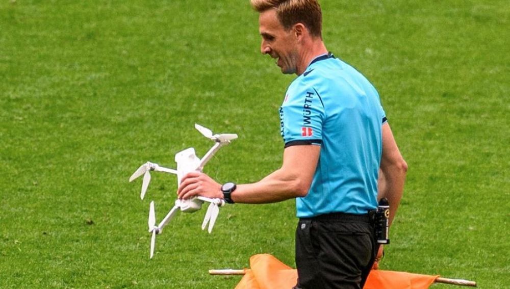En el minuto 68 del partido entre el Athletic y el Eibar en San Mamés cayó al campo un dron, ajeno a la retransmisión televisiva, cerca de la banda izquierda del campo que defendía el equipo rojiblanco. El árbitro, Pizarro Gómez, interrumpió el partido para retirar el aparato del terreno de juego y se lo entregó al delegado del campo.