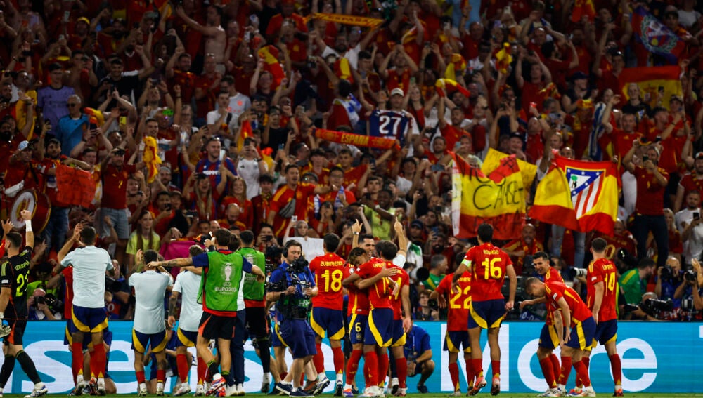 Los jugadores de la selección española celebran su pase a la final tras derrotar a la selección de Francia durante el partido de semifinales de la Eurocopa de fútbol que España y Francia disputaron en Múnich. EFE/Alberto Estévez. | Agencia EFE