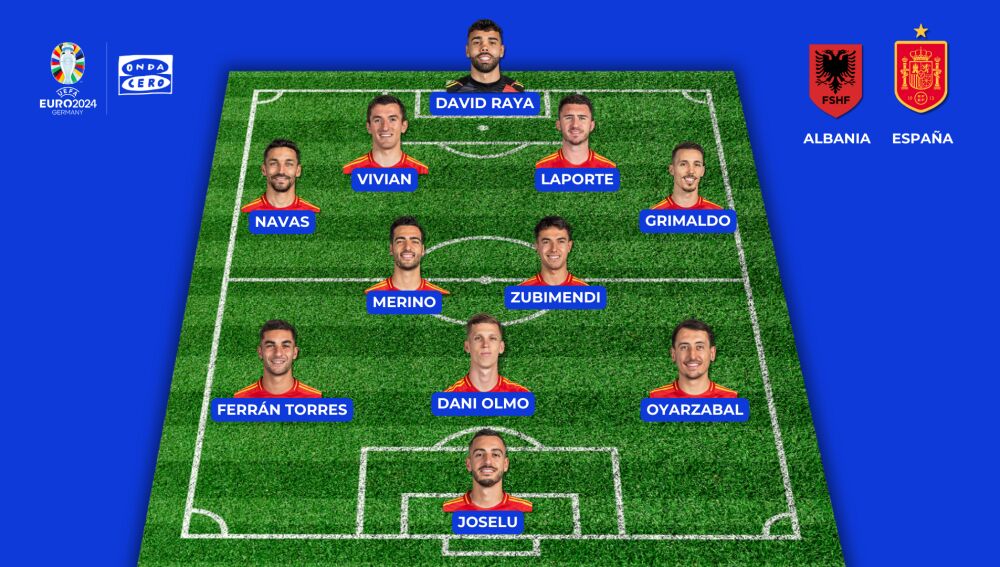 Este podría ser el once titular de Luis de la Fuente contra Albania: David Raya; Jesús Navas, Vivian, Laporte, Grimaldo; Zubimendi, Merino; Ferran, Dani Olmo, Oyarzabal; y Joselu.