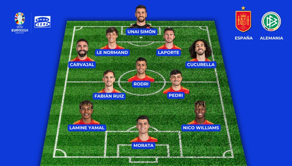 España forma en un 4-3-3 con Unai Simón; Carvajal, Laporte, Le Normand, Cucurella; Rodri, Fabián, Pedri/Olmo; Lamine Yamal, Morata y Nico Williams.