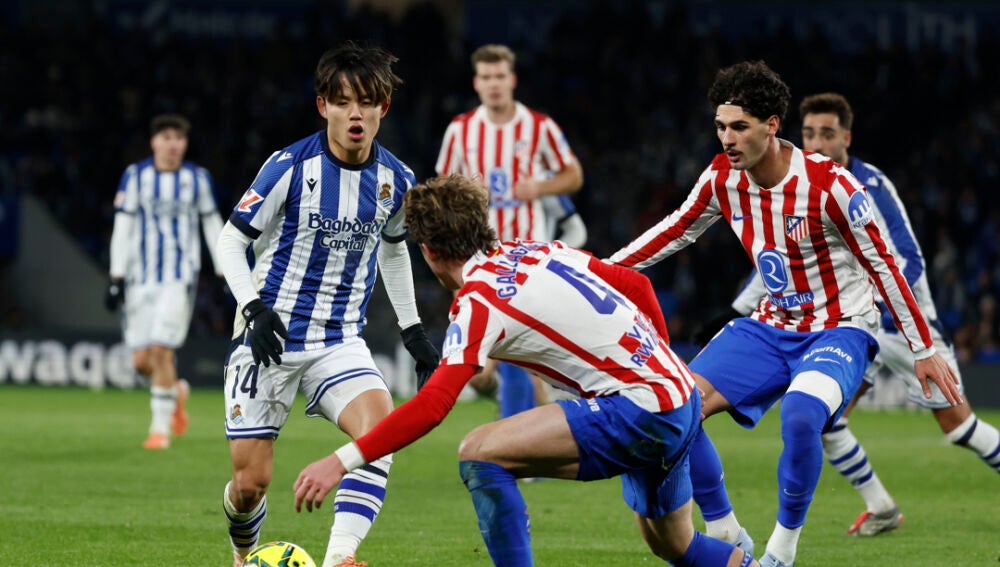 La nueva Real de Matarazzo arrancó con ganas y fuerza mediante una presión alta y con un par de acciones a balón parado en los primeros tres minutos y Oyarzabal remató muy cerca del palo zurdo de Oblak desde fuera del área (minuto 4). Eso sí, los colchoneros reaccionaron rápido con una volea de Julián Álvarez a la salida de un córner que se marchó por encima de la portería de Remiro. En el minuto 12, “La Araña” volvió a tener en sus botas el 0-1 tras una buena acción trenzada de los madrileños, pero su derechazo se marchó ligeramente desviado. Cuatro minutos más tarde, Oblak tuvo que intervenir para mandar un buen remate desde el balcón del área de Brais Méndez en lo que fue el primer disparo entre palos del encuentro.