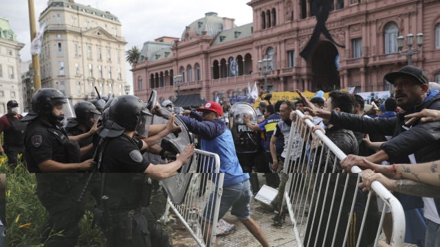 Los antidisturbios han tenido que cargar ante la avalancha de hinchas que se encontraban congregados para intentar acceder al velatorio de Maradona en la Casa Rosada de Buenos Aires.