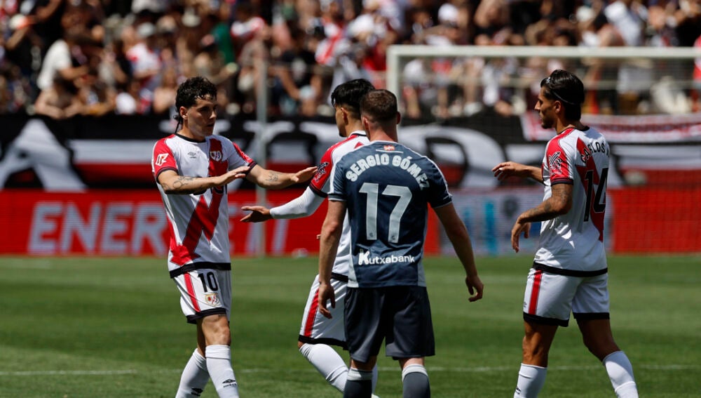 Su celebración tuvo dedicatoria. Se acercó al banquillo y abrazó al argentino Oscar Trejo, que celebraba su 38 cumpleaños y se marchará a final de temporada convertido en un símbolo del Rayo. Antes de ese gol del Rayo, la Real Sociedad demostró el nivel que atesora como equipo y la calidad que tienen jugadores como el japonés Take Kubo, el centrocampista Carlos Soler o Mikel Oyarzabal, que se fabricó un gol solo a los 22 minutos. Recibió en la frontal, se marchó de Florian Lejeune y Pathé Ciss y se sacó un disparo raso al paso cambiado de Dani Cárdenas, que atónito vio como el balón se metía en el fondo de las mallas.