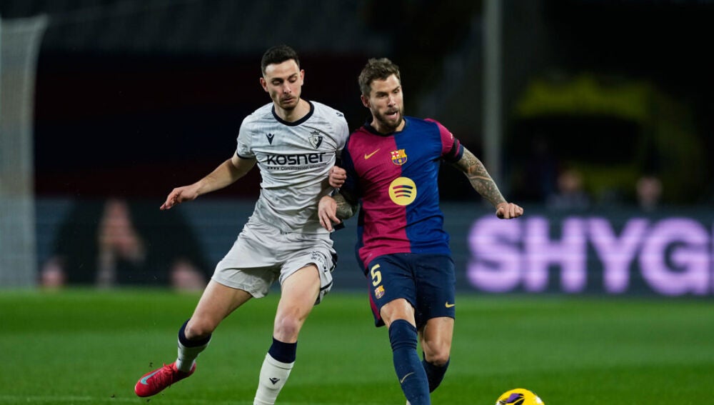 El defensa del F.C. Barcelona Iñigo Martínez (d) disputa un balón con el delantero del Osasuna Raúl García durante el partido de LaLiga entre FC Barcelona y CA Osasuna en el Estadio Olímpico de Montjuic, el pasado 23 de marzo | EFE
