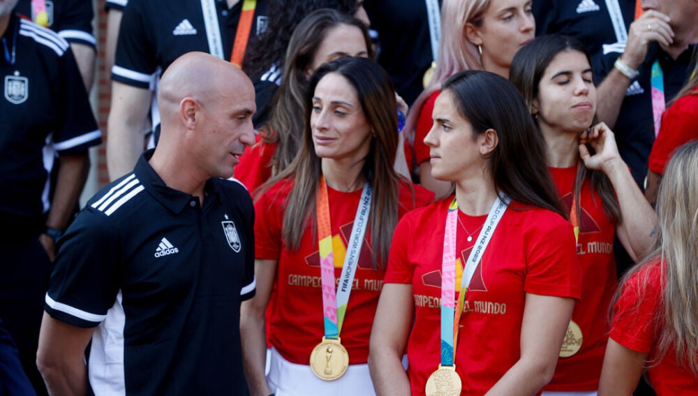 El presidente de Real Federación Española de Fútbol (RFEF), Luis Rubiales (i) conversa con las jugadoras Esther González (c) y Rocío Gálvez (d) durante la recepción del Presidente del Gobierno Pedro Sánchez al equipo en el Palacio de la Moncloa en Madrid, este martes, tras su victoria en la Copa del Mundo. | Agencia EFE