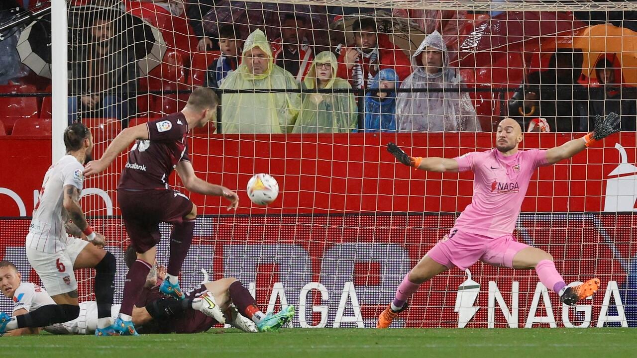La formación guipuzcoana reaccionó ante el dominio sevillano con la entrada de David Silva y Jon Guridi y al momento se fue con descaro hacia la portería que defendió Dmitrovic para crear casi consecutivamente tres buenas opciones para poner el 0-1, una de ellas con un remate al palo de Portu.