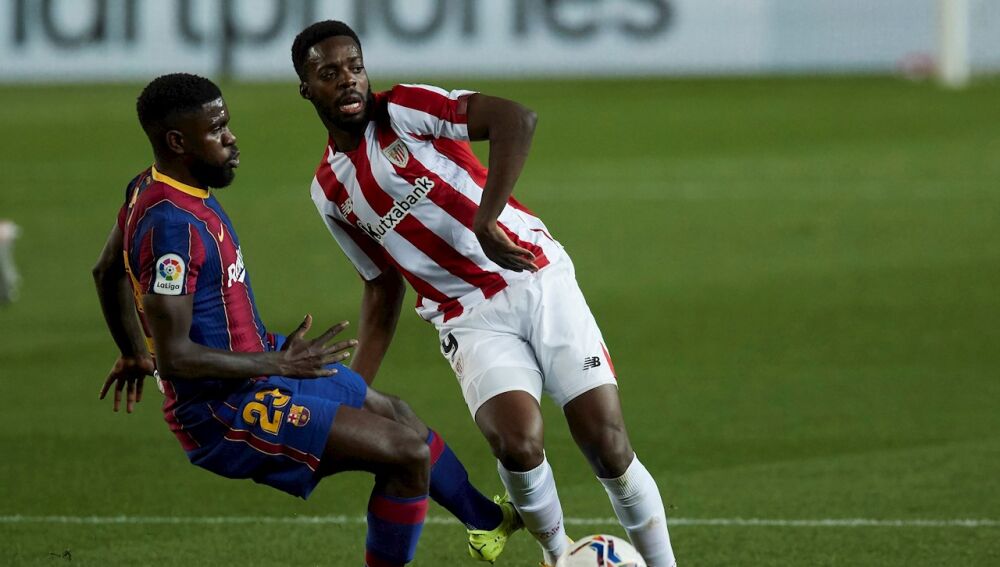 El jugador del Barcelona Samuel Umtiti, y el jugador del Athetic de Bilbao Iñaki Williams, en el partido correspondiente a la vigésimaprimera jornada de LaLiga Santander disputado en el Camp Nou. | EFE