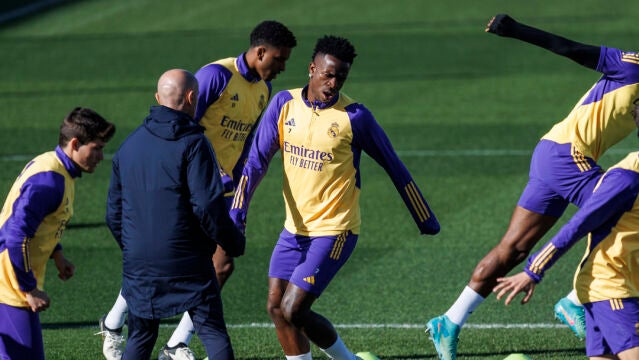 Carlo Ancelotti examinó de cerca la evolución de Vinícius de los problemas cervicales que le impidieron jugar el derbi madrileño ante el Atlético de Madrid el pasado domingo y el estado de Rüdiger, mejorado del fuerte golpe sufrido hace ochos días en el muslo izquierdo ante el Getafe.
