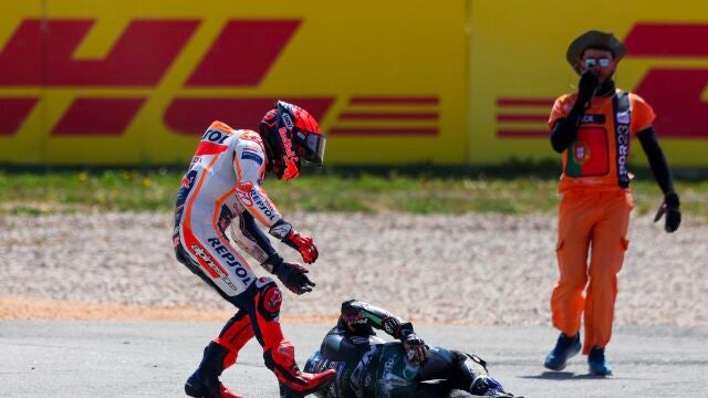 "Me da la sensación de que no aprendemos, ya que después de las caídas de ayer, hoy la gente ha arrancado igual. Binder me ha chocado y la primera vuelta de Joan Mir es una locura. No sé si podéis ver mi cámara 'on board'... parecía jugar a los bolos cuando tenía que perder cinco segundos con su penalización. ¿Qué más te da? ¿Para qué te vas a cargar a tres más si tienes que perder cinco segundos? Estas cosas son las que no acabo de entender y luego el accidente de Marc me parece gravísimo".