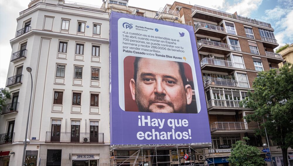En la pancarta se puede leer una cita del ex líder del partido, Pablo Casado, en la que cuestionaba "si es entendible que el 1 de abril, cuando morían en España 700 personas, se puede contratar con tu hermana y recibir 286.000 euros de beneficio por vender mascarillas". Debajo del supuesto tweet, con un fondo de color morado, puede leerse el mensaje "¡Hay que echarlos!".