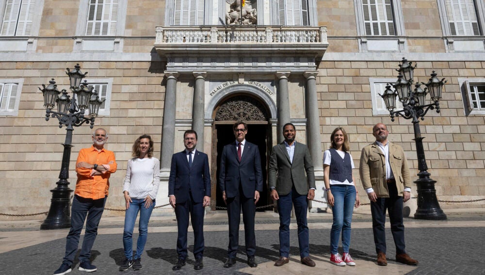 En la foto de 'familia' de la jornada de reflexión han sido retratados Salvador Illa (PSC), el presidente Pere Aragonès (ERC), Ignacio Garriga (Vox), Laia Estrada (CUP), Jéssica Albiach (Comuns Sumar), Carlos Carrizosa (Cs) y Alejandro Fernández (PP).
