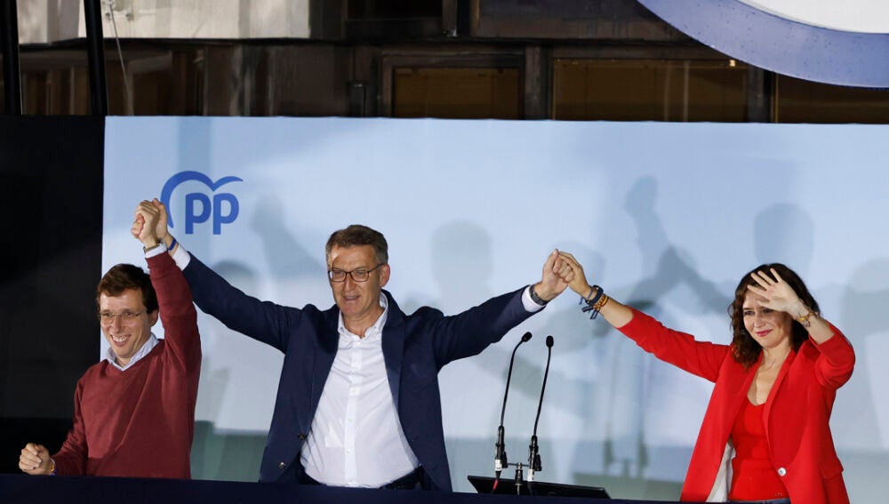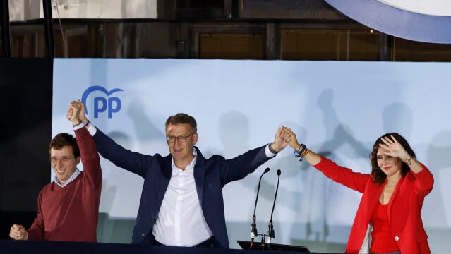 Presidenta y alcalde, que no van a necesitar de Vox para gobernar ni tendrán a Unidas Podemos en sus respectivos hemiciclos, han saludado desde el balcón a miles de simpatizantes del PP que han ido viendo el escrutinio en una pantalla gigante, aderezado con música que ha retumbado por toda la calle de Génova, donde ha seguido la noche electoral también el presidente de los populares, Alberto Núñez Feijóo, a quien se ha proclamado presidente desde el balcón y desde la calle.