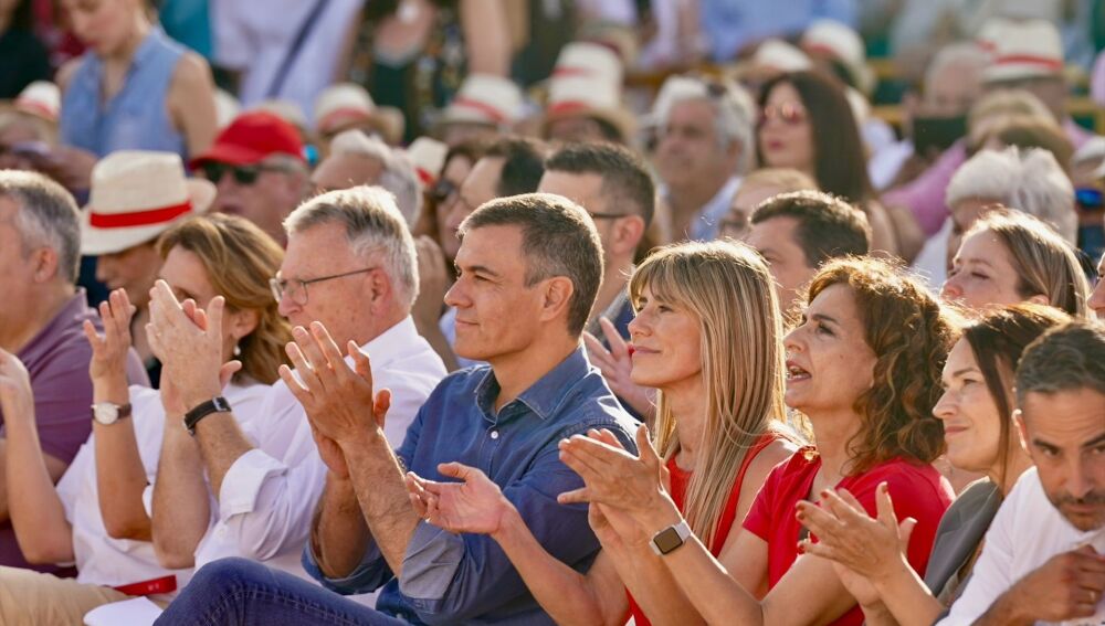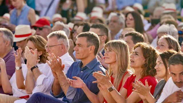 Gómez, que hasta el momento no había acompañado a Sánchez en ningún mitin durante esta campaña de elecciones europeas está sentada en primera fila junto al líder del PSOE y el resto de la plana mayor del partido: la vicepresidenta del Gobierno y vicesecretaria general, María Jesús Montero, el secretario de Organización, Santos Cerdán, y el líder de los socialistas andaluces, Juan Espadas.