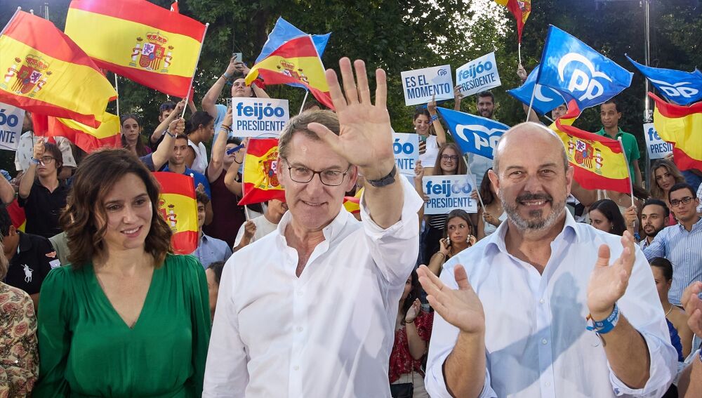 Imagen de archivo de Isabel Díaz Ayuso, Alberto Núñez Feijóo y Pedro Rollán durante la campaña para el 23J | Europa Press