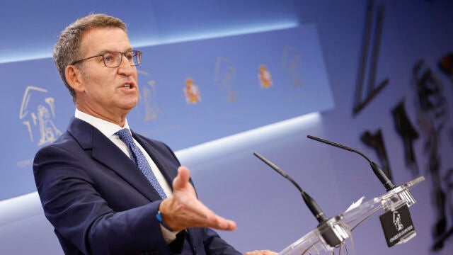 El líder del PP, Alberto Núñez Feijóo, en rueda de prensa | EFE/MARISCAL