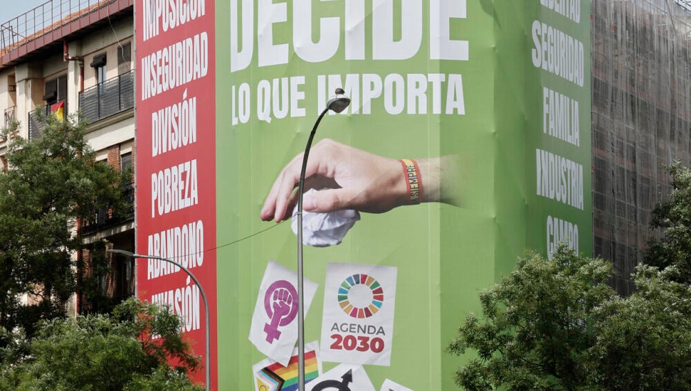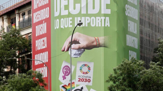 La Junta Electoral de Zona de Madrid ha requerido a Vox que retire la lona de grandes dimensiones que instaló en la fachada de un céntrico edificio de la capital con consignas contra el feminismo, el comunismo y el movimiento Lgtbi.