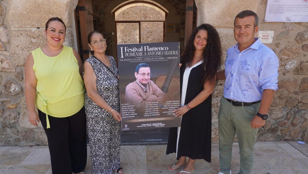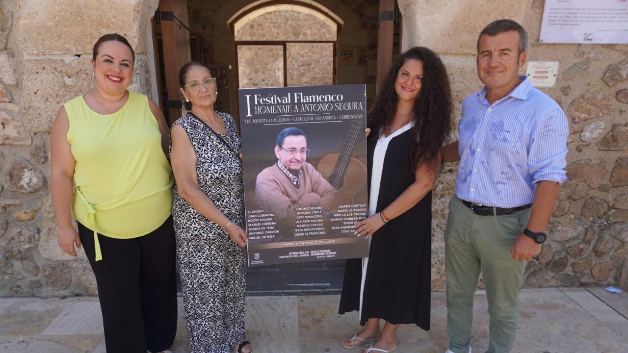 El evento ha sido presentado por el alcalde de Carboneras, Salvador Hernández, la esposa del homenajeado, Antonia López, y su hija, la cantaora Rocío Segura, acompañados por la concejala de Cultura, Ana María Caparrós, en el propio Castillo donde tendrá lugar el festival.