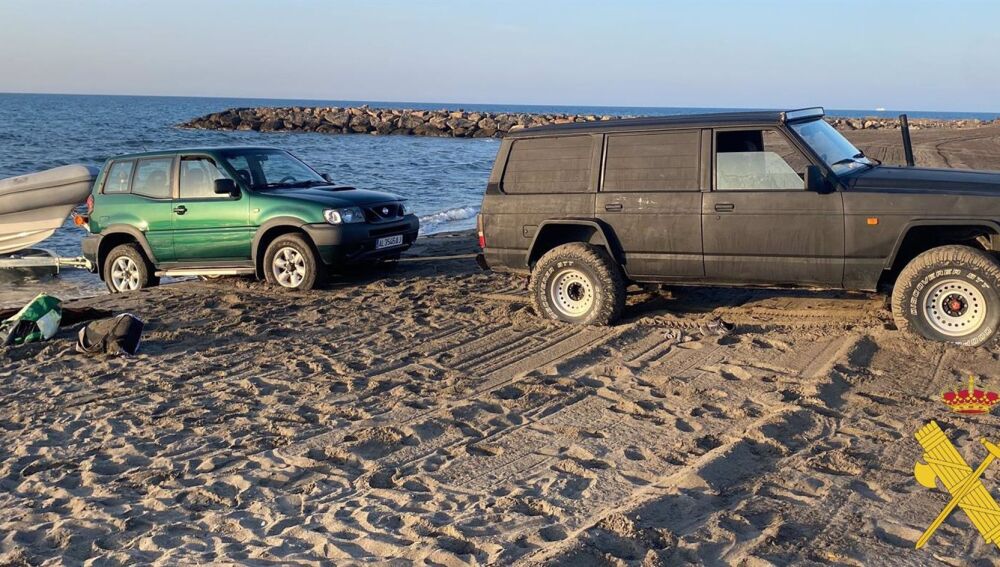 Finalmente, los agentes sorprendieron a un grupo de cuatro personas organizadas en el momento en el que que trataban de remolcar la embarcación con dos vehículos todoterreno, uno de ellos de gran tamaño y preparado para la ocultación de su interior.
