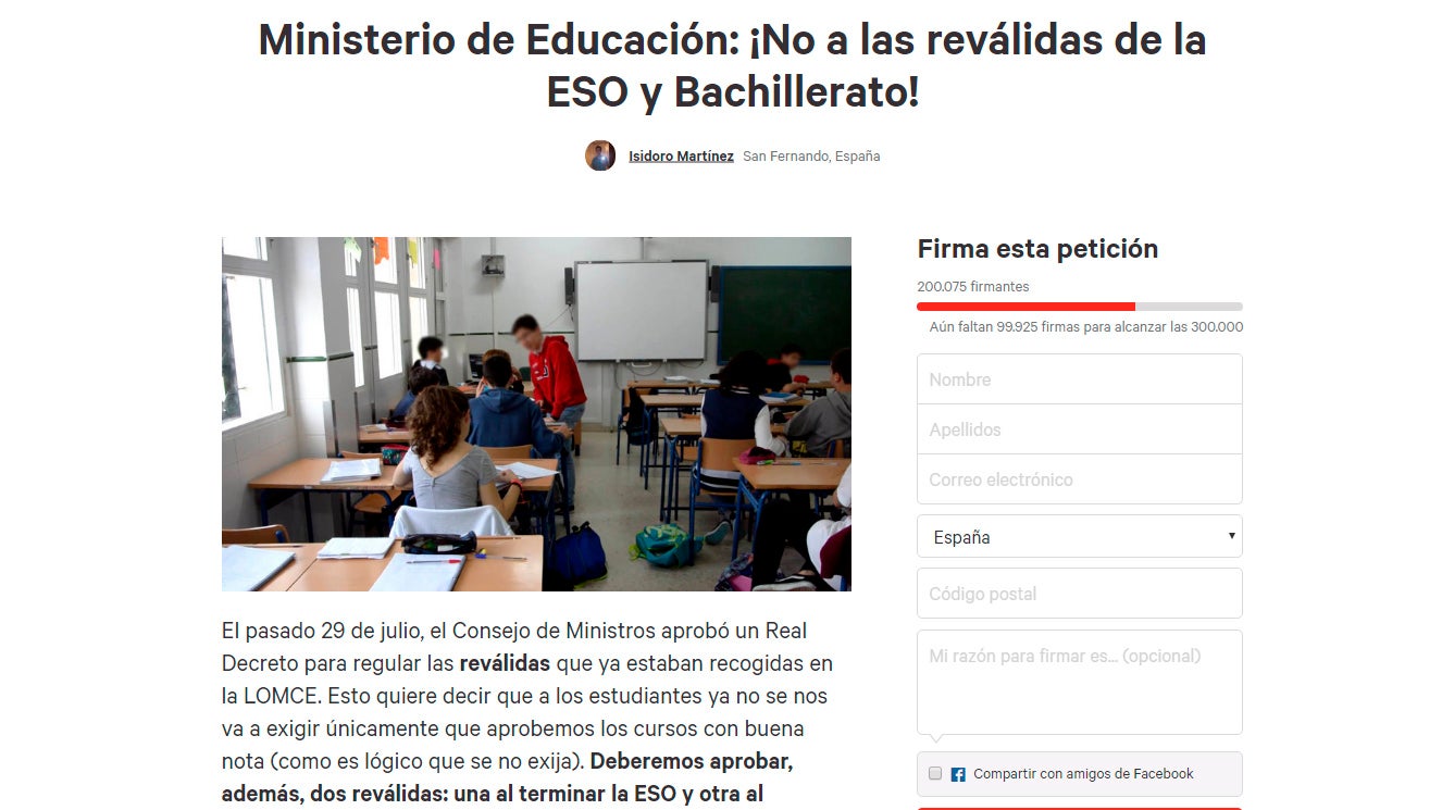 El alumno, de nombre Isidoro Martínez, explica en la plataforma de peticiones ciudadanas Change.org que ha iniciado esta campaña de recogida de firmas junto a otros compañeros de tercero de la ESO con el objetivo de trasladar al ministro de Educación, Íñigo de Méndez de Vigo, su desacuerdo con el sistema de las reválidas.