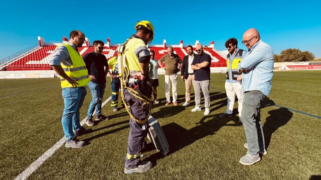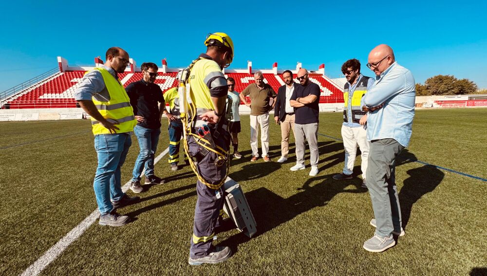 El alcalde de El Puerto, Germán Beardo, acompañado del concejal de Deportes, José Ignacio González, ha visitado el Estadio José del Cuvillo junto al presidente del Racing Club Portuense, Jesús Rodríguez, para supervisar los trabajos de iluminación que marcan el inicio de la segunda fase de rehabilitación del estadio. Esta nueva actuación contempla la instalación de una luminaria de categoría 2, homologada para competiciones nacionales, lo que permitirá que el Racing vuelva a disputar partidos en horario de tarde y de noche. La nueva iluminación de alta potencia contará con 20 focos de 1.200 W, distribuidos en cuatro torretas con cinco focos cada una.