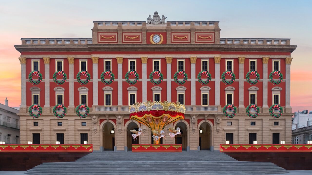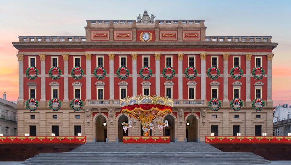 Así, en el atrio del Ayuntamiento, se instalará un gran elemento escenográfico central de inspiración navideña. Se trata de una pieza de tiovivo ornamental que ocupará los tres arcos centrales de la fachada, con unas dimensiones aproximadas de siete metros de altura. Tres caballos a distintas alturas que contará además con un sistema de iluminación artística diseñado para resaltar cada elemento.