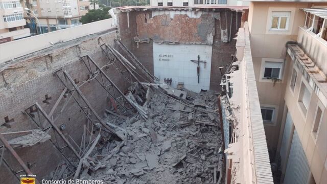 Según ha explicado el Consorcio Provincial de Bomberos, la Capilla, que se aloja en un espacio anexo al colegio, tiene una proporción de unos 25/15 metros cuadrados. Por prevención se han desalojado las estancias de las religiosas hasta completar la inspección que están llevando a cabo los bomberos. Asimismo, ha señalado que la caída del techo ha producido, en efecto latigazo, una rotura en el muro exterior que da a la Avenida donde se ubica a la altura del pilar afectado. Por ello, los bomberos han realizado un perímetro de seguridad en los 15 meros del frontal ante el riesgo de que el muro abata contra el suelo y se derrumbe.
