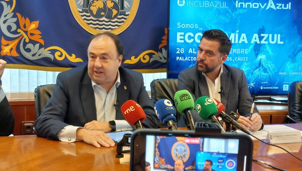 El delegado de la Zona Franca de Cádiz, Fran González, el rector de la Universidad de Cádiz y presidente de la Fundación CEI·Mar, Casimiro Mantell, acompañados del alcalde de Cádiz, Bruno García, como colaborador del evento, y los representantes de los patrocinadores, Caja Rural del Sur, Petaca Chico y Telefónica, han avanzado hoy el panel de patrocinadores y algunos hitos relevantes de la programación del Blue Zone Forum-Innovazul 2024, que se celebrará en el Palacio de Congresos de Cádiz del 20 al 22 de noviembre organizado por Zona Franca, UCA, CEI-Mar e Incubazul. Puertos del Estado, Junta de Andalucía y Fundación Cajasol, que también son colaboradores del encuentro, no han podido estar en la presentación de hoy.