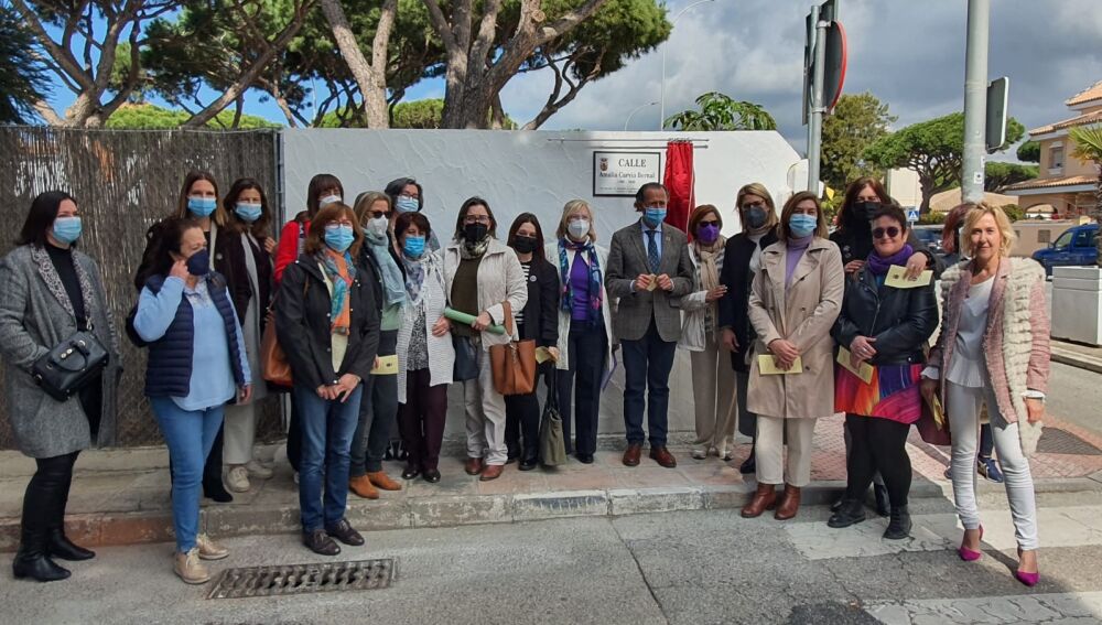 El alcalde de Chiclana, José María Román, ha inaugurado en la urbanización Pinar de Don Jesús la calle en honor a Amalia Carvia Bernal, con motivo de la conmemoración del Día Internacional de las Mujeres. Un acto en el que también han estado presentes la delegada municipal de Mujer, Susana Rivas, así como miembros de la Corporación Municipal y representantes de los diferentes colectivos de mujer de la ciudad, entre ellas, Luisa Moreno, actual vicepresidenta segunda del Consejo de las Mujeres, quien ha sido la encargada de leer un manifiesto sobre Amalia Carvia.