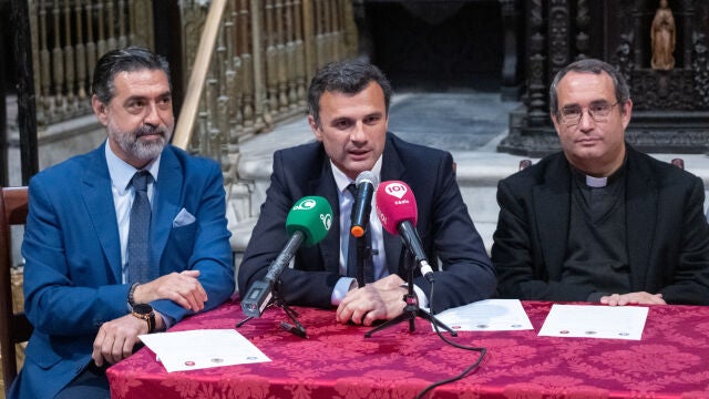 El cartel de la festividad de Corpus de este año y la programación de actos han sido presentados esta tarde en la Catedral de Cádiz. En el acto, que se ha llevado a cabo en el coro del primer templo diocesano, han estado presentes el alcalde de la ciudad, Bruno García; el concejal de Hermandades y Cofradías, José Manuel Verdulla; el deán de la Catedral, Ricardo Jiménez Merlo; el presidente del Consejo Local de Hermandades y Cofradías, Juan Carlos Jurado; el prior del convento de Santo Domingo, Pascual Saturio Medina; y el autor del cartel de este año, José María García Gallardo.