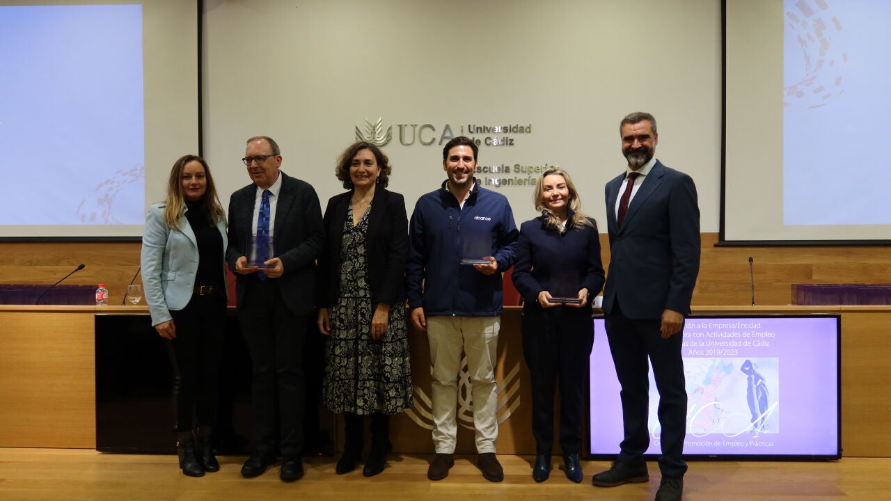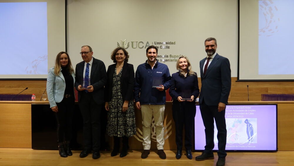 El rector en funciones de la Universidad de Cádiz, Francisco Piniella, ha presidido hoy, en la Escuela Superior de Ingeniería, la entrega de distinciones a empresas colaboradoras en actividades de Empleo y Prácticas con la Universidad de Cádiz, periodo 2019/2023. La secretaria del Consejo Social de la UCA, Olga de la Pascua, la secretaria General de la Confederación de Empresarios de la provincia de Cádiz (CEC), Carmen Romero, y el director General del Centro de Promoción de Empleo y Prácticas en funciones de la UCA, Luis López, le han acompañado en este encuentro presencial con un centenar de representantes de las entidades homenajeadas de la provincia.