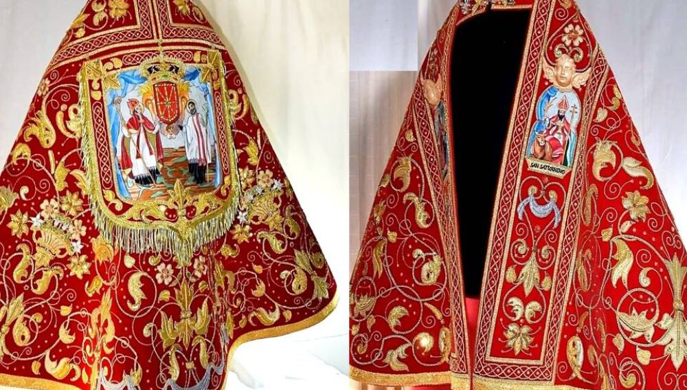 Esta capa pluvial, en forma de capote, representa, en su parte más trabajada, a San Fermín y San Francisco Javier sosteniendo el escudo del reino de Navarra y en la estola dos arcos de la Catedral de Pamplona. Pero el manto también lleva entre sus hilos elementos decorativos alusivos a su manufactura cordobesa y palmeña, como ha contado Rafael Carmona a Onda Cero Córdoba, entre ellos, unas ondas que recuerdan la unión del río Guadalquivir con el Genil, delicadas flores de jazmín y de azahar, y en el frontal, unos arcos polilobulados, que evocan a los de la mezquita-catedral de Córdoba, cobijan unas sedas de San Lorenzo y San Saturnino.
