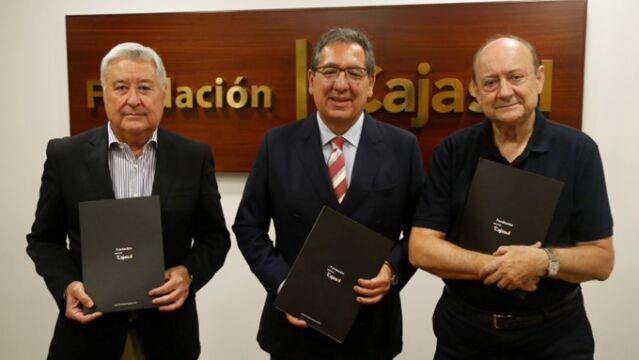 El presidente de la Fundación Antonio Gala, Francisco Moreno Crespo, el presidente de la Fundación Cajasol, Antonio Pulido, y el presidente del Ateneo de Córdoba, Federico Roca de Torres, han firmado, por segundo año consecutivo, el convenio de colaboración para la puesta en marcha de la semana cultural “Córdoba de Gala”.