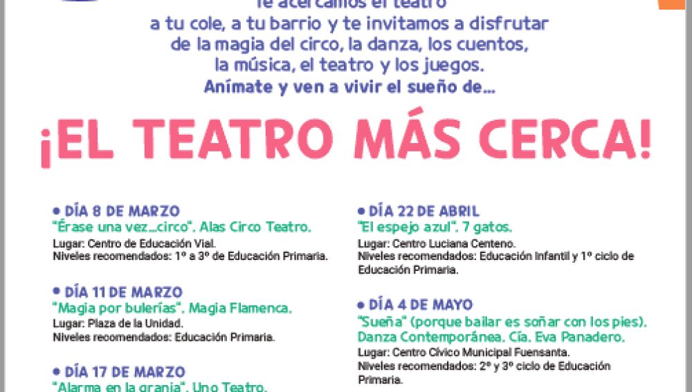 La Delegación de Educación e Infancia del Ayuntamiento ha programado 14 actividades para acercar el teatro a los escolares de entre 4 y 12 años, utilizando las artes escénicas como recurso educativo.Centros Cívicos, el centro de Educación Vial, centros vecinales como el Luciana Centeno, colegios, barriadas periféricas como el Higuerón o espacios abiertos como la Plaza de la Unidad en el sector sur acogerán espectáculos de teatro, música, danza y circo.