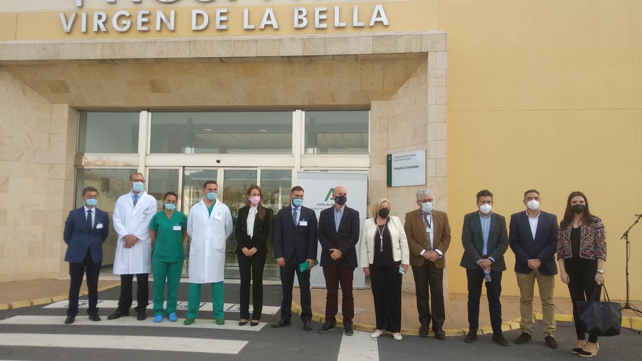 A sus puertas y acompañada por el alcalde de Lepe, Juan Manuel González y otras autoridades, ha descubierto la placa que representa el acuerdo alcanzado entre la Administración autonómica y la empresa para la disponibilidad de ese centro sanitario como refuerzo asistencial para todos los ciudadanos del Área Sanitaria de la Costa Occidental de Huelva.