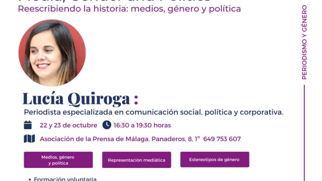 La periodista Lucía Quiroga, experta en comunicación social, política y corporativa, impartirá en la Asociación de la Prensa de Málaga (APM) un taller patrocinado por la Unión Europea sobre Periodismo y Género. De dos días de duración (22 y 23 de octubre) con entrada es libre hasta completar el aforo, previa inscripción.
