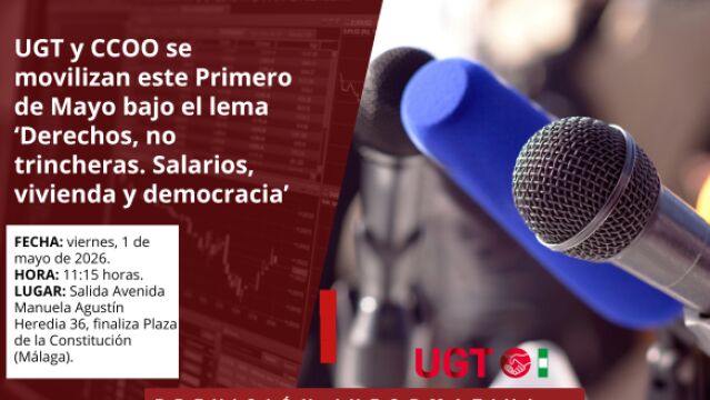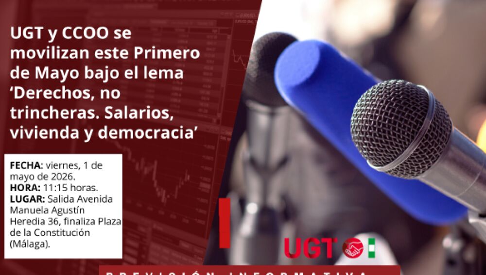 De cara al festivo de mañana, CCOO y UGT van a celebrar en Málaga la manifestación central por el Primero de Mayo, Día del Trabajador, con el objetivo de reivindicar el derecho a la vivienda y salarios dignos.