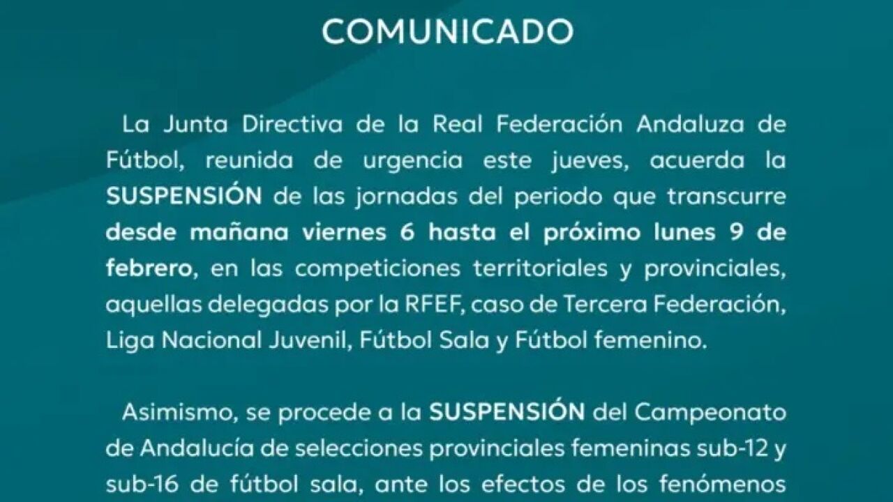 Las Federaciones de deporte base andaluz llevaron a cabo una reunión con carácter de urgencia este jueves en la que decidieron suspender toda la actividad competitiva. La decisión llega siguiendo las predicciones meteorológicas que alertan del paso de nuevas borrascas por el territorio andaluz, y ante las distintas alertas por fenómenos meteorológicos lanzados por la Agencia Estatal de Meteorología.