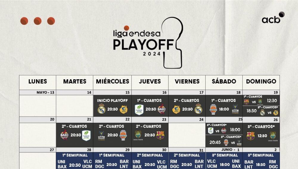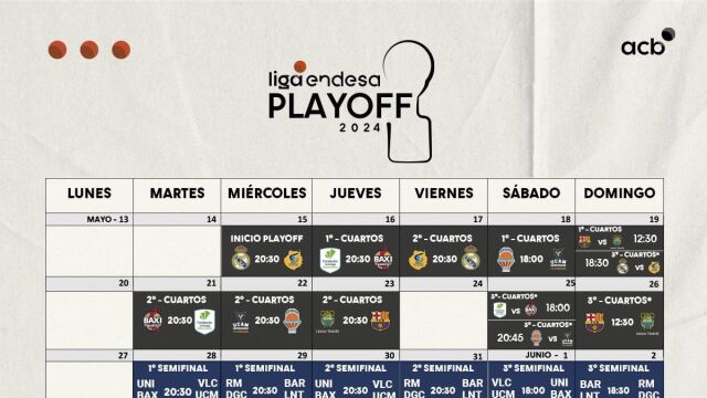 El miércoles 15 de mayo empieza el camino hacia el título de la Liga Endesa 2023-24 con el encuentro del Madrid, dado que el fin de semana del 24 de mayo disputa la Final Four de la Euroliga. Unicaja empieza el jueves, visitando el Nou Congost en el segundo partido el martes a las 20:30. En el caso de un tercero sería el sábado a las 20:30 en Málaga.