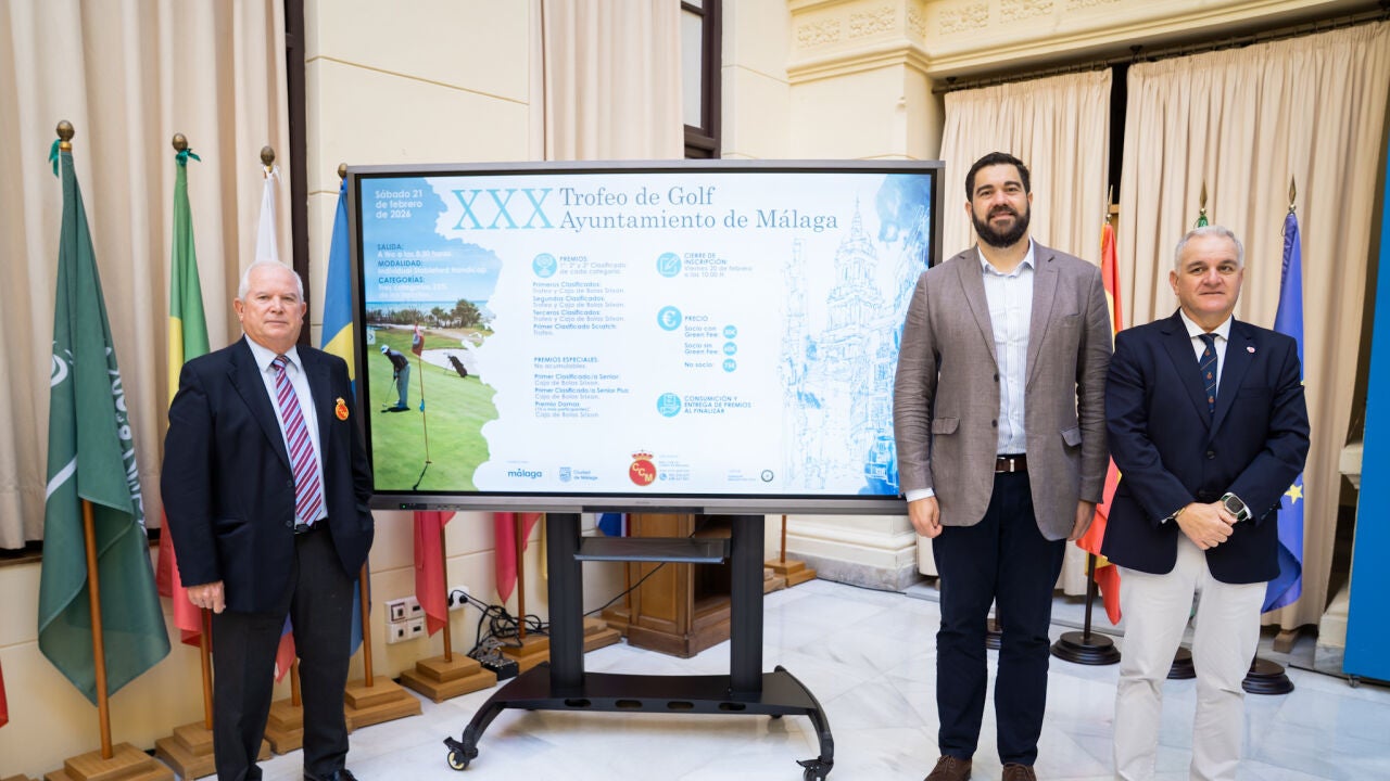 El XXX Torneo ‘Ayuntamiento de Málaga’, que cuenta con el patrocinio del Consistorio, a través del Área de Deporte, se celebrará el sábado, 21 de febrero, en las instalaciones del Parador de Golf. El concejal delegado de Deporte, Borja Vivas, junto al presidente y el vicepresidente del Real Club de Campo de Málaga (RCCM), Antonio Cerdán y José Antonio García, respectivamente, ha presentado esta competición.