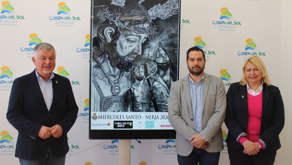 El presidente de la Mancomunidad de Municipios de la Costa del Sol Axarquía, Jorge Martín; la concejala de Cultura y Turismo del Ayuntamiento de Nerja, Ana María Muñoz y el hermano mayor del grupo parroquial Nuestro Padre Señor Cautivo, María Santísima de los Desamparados y San Juan Evangelista, Antonio del Corral han informado sobre la presencia de la Hermandad de Antiguos Caballeros Legionarios de Torremolinos el Miércoles Santo en Nerja.
