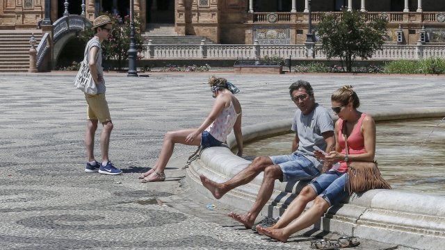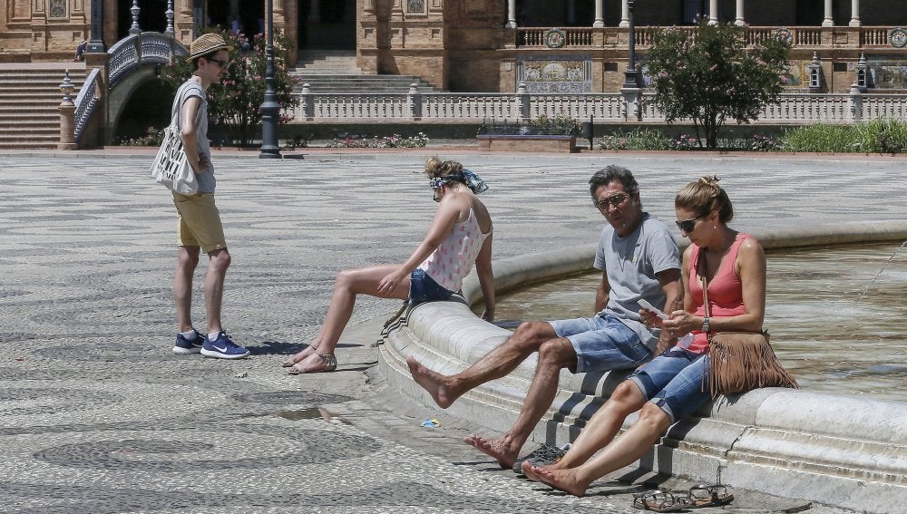 Turistas se refrescan en la plaza de España en Sevilla | EFE