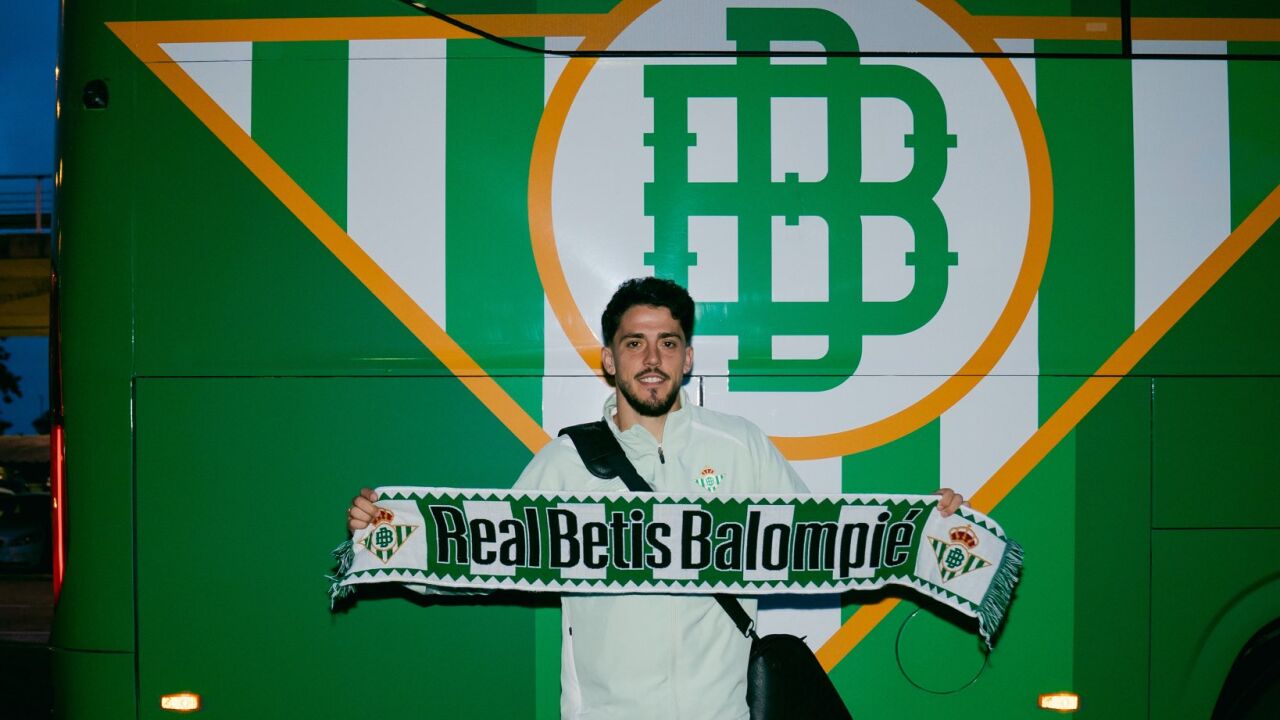 Pablo Fornals posa con una bufanda del Betis antes de volar a Tesalónica. | Real Betis