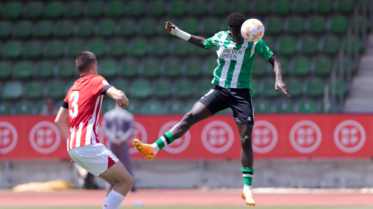 El bético Assane Diao cabecea un centro de Busto para hacer el 1-0 en la semifinal ante el Athletic. | Real Betis
