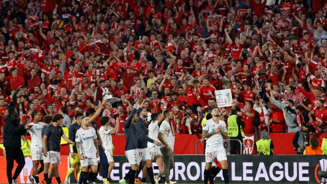 Los jugadores del Sevilla FC celebran con la afición el pase a la final. | EFE