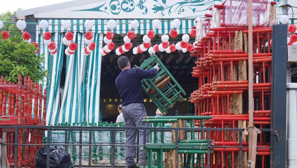 Trabajadores preparan y adecentan una de las casetas del recinto de la Feria de Abril de Sevilla | Europa Press