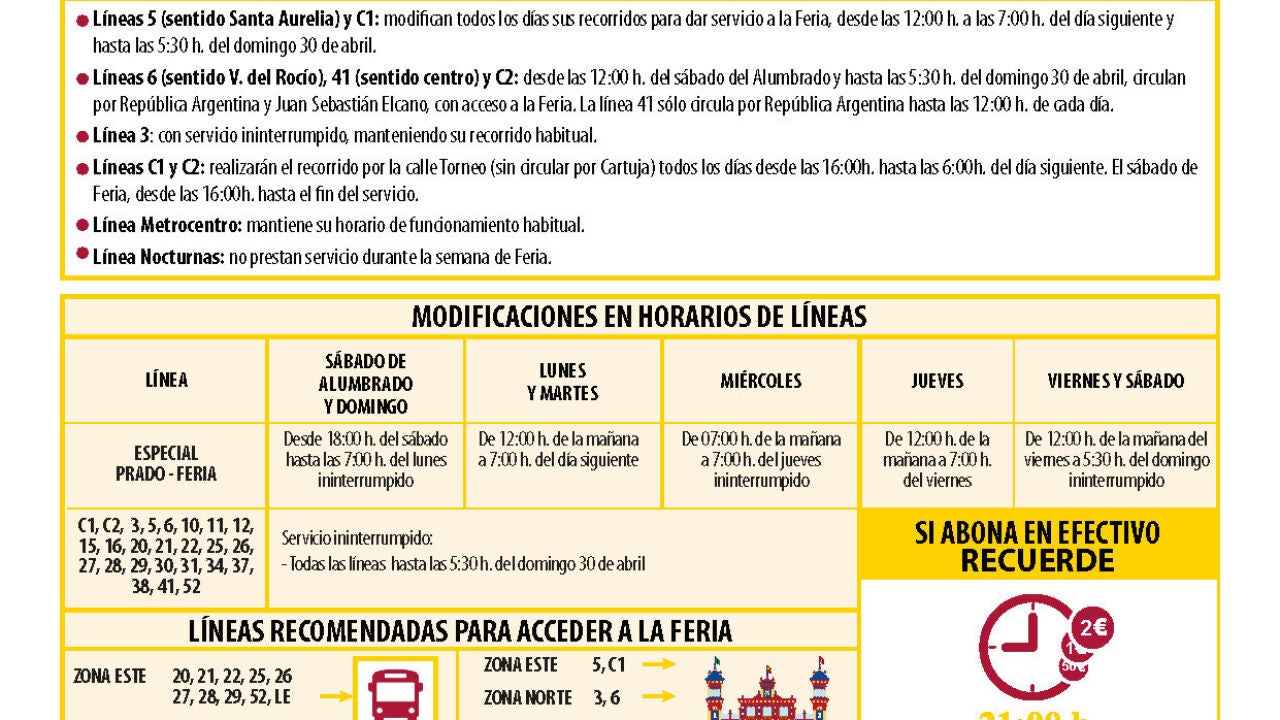 Líneas 6 (sentido V.Rocío), 41 (sentido centro) y C2: Desde las 12:00h. del Sábado de Alumbrado y hasta las 5:30 del domingo 30 de abril, circulan por República Argentina y Juan Sebastián Elcano, con acceso a la Feria. La línea 41 sólo circula por República Argentina hasta las 12:00 de cada día.