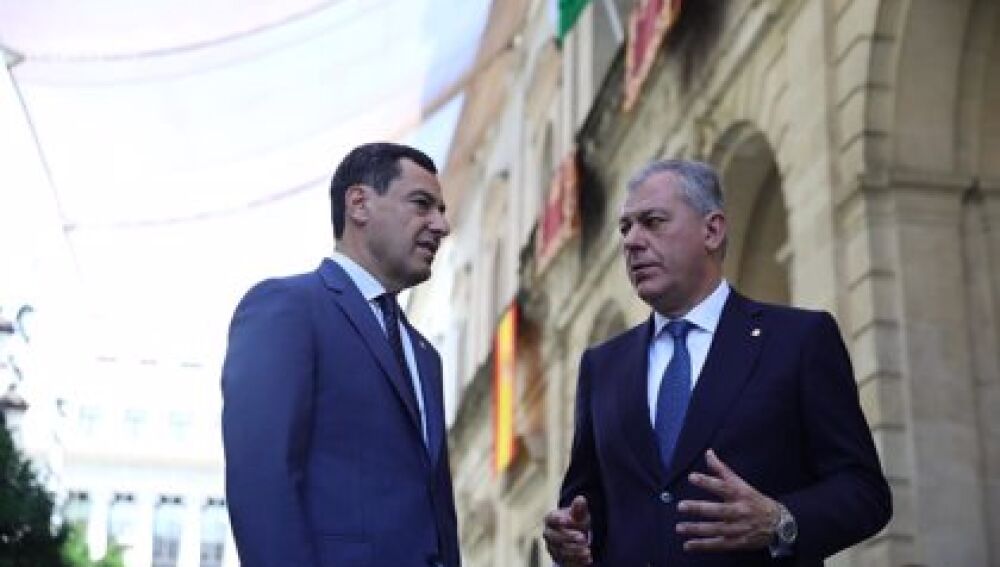 El presidente de la Junta de Andalucía, Juanma Moreno, junto al alcalde de Sevilla, José Luis Sanz, a las puertas del Consistorio. | Europa Press
