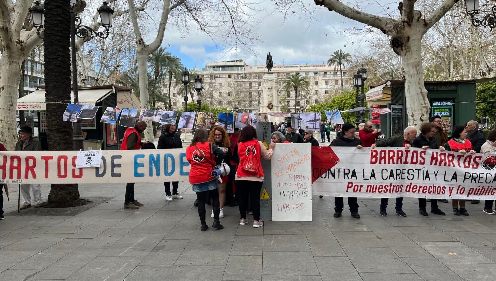 Vecinos y miembros de la plataforma Barrios Hartos se han reunido este lunes en el ayuntamiento de Sevilla con responsables de los diferentes grupos políticos para exigir soluciones a los continuos apagones que sufren en sus barrios.